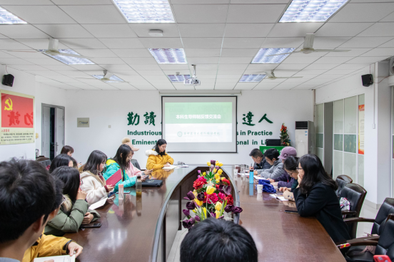 听取学生代表反馈后,导师代表结合已开展工作先后发表了自己的看法。陈晓彤在了解学生差异性特点及需求后,积极为学生提供信息分享,并组织班级结对,开展了高低年级间的交流;肖潇强调了轻松的交流氛围的重要性,表示十分支持学生适当参与导师的科研项目;徐贝贝通过反思前期交流情况,认为师生间交流具有双向性,需要共同努力,赞同定期开展师生交流日等活动;汪晓燕结合自身感受,提出学生自主性存在两极分化的问题;王菲指出导师的细致关怀及师生间换位思考十分有必要,导师需要对学生做到个性化、差异化指导;丁杨、潘不寒先后谈到面对面交流的益处,认为师生双方都应做到一定程度的主动;许雪芬、李敏锐也从所见所感谈及了自身的体会。