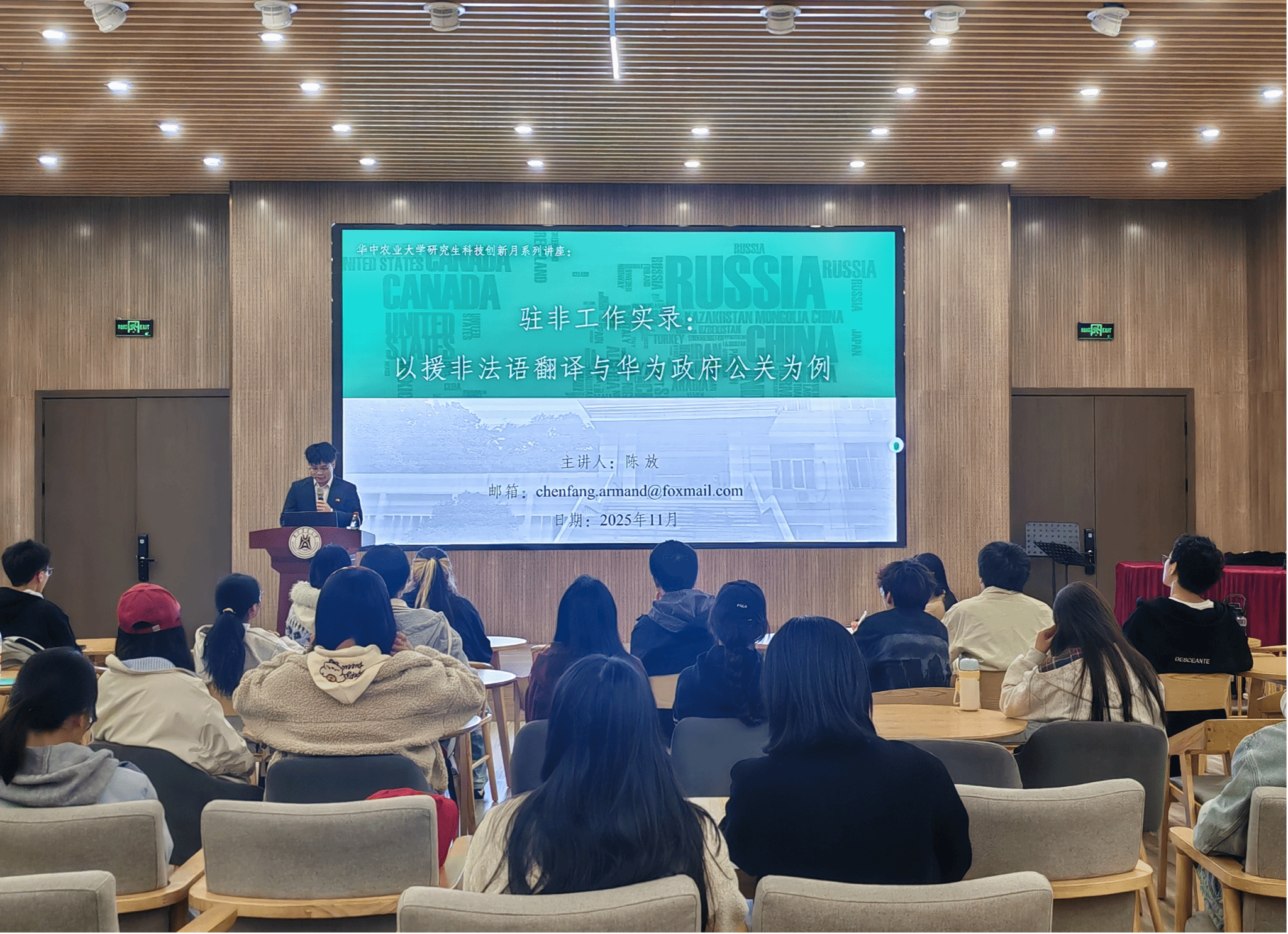 2025年11月13日晚,tyc122cc太阳成集团科技创新月系列活动之“与理想对话”在大学生活动中心报告厅举办。本次活动以“驻非工作实录——以援非法语翻译与华为政府公关为例”为主题,邀请2023级硕士研究生陈放分享其驻非工作经历,研究生辅导员袁梦瑶老师出席活动,本研同学共同聆听分享。