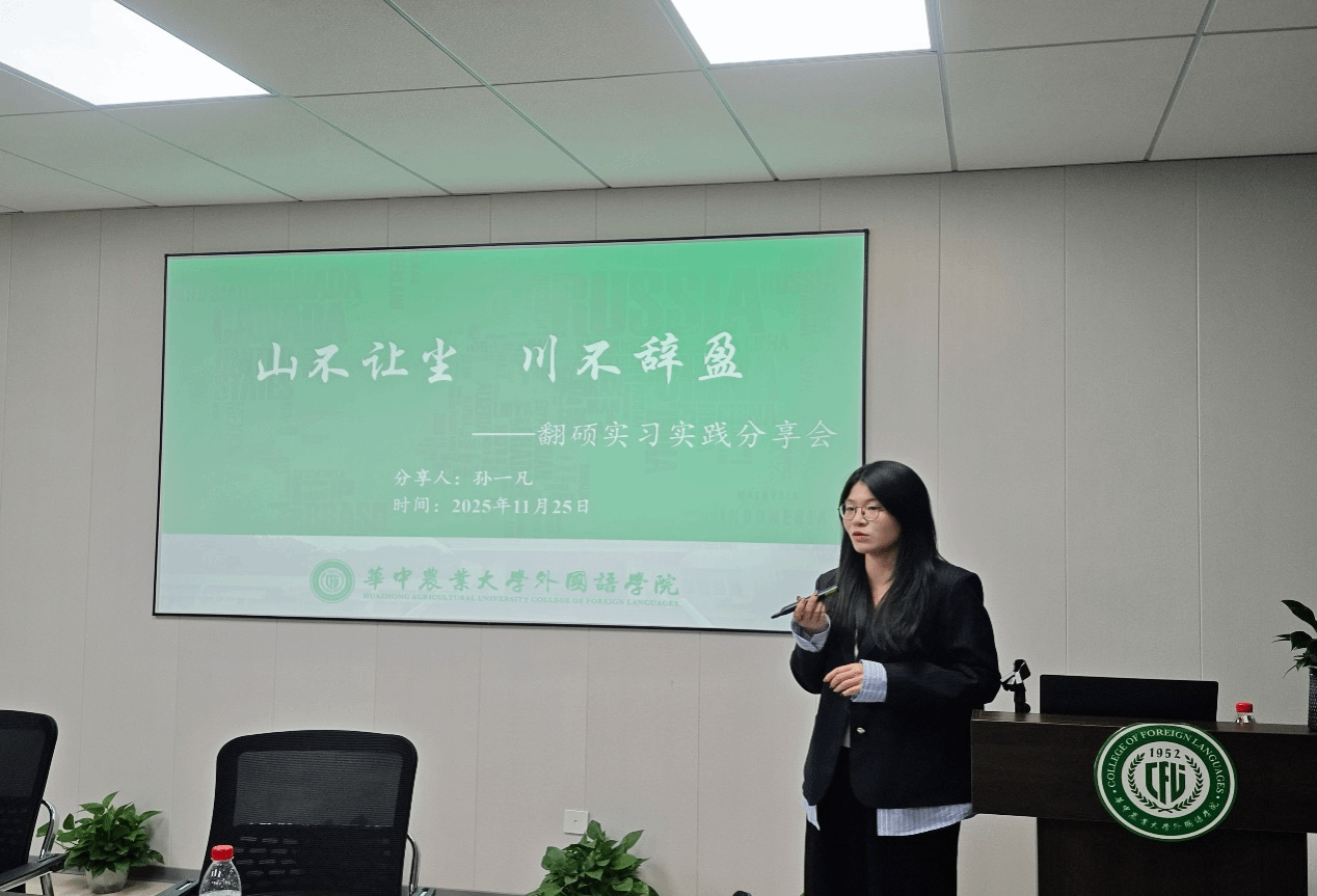 11月25日,tyc122cc太阳成集团成功举办翻译硕士(MTI)实习实践专题分享会,邀请2024级翻硕研究生孙一凡同学,从学业竞赛、科研探索与专业实践三个方面,为师弟师妹们全面呈现翻硕学习的成长路径与实践收获。本次分享会内容充实、案例丰富、指导性强,为在场同学提供了宝贵的学习借鉴。