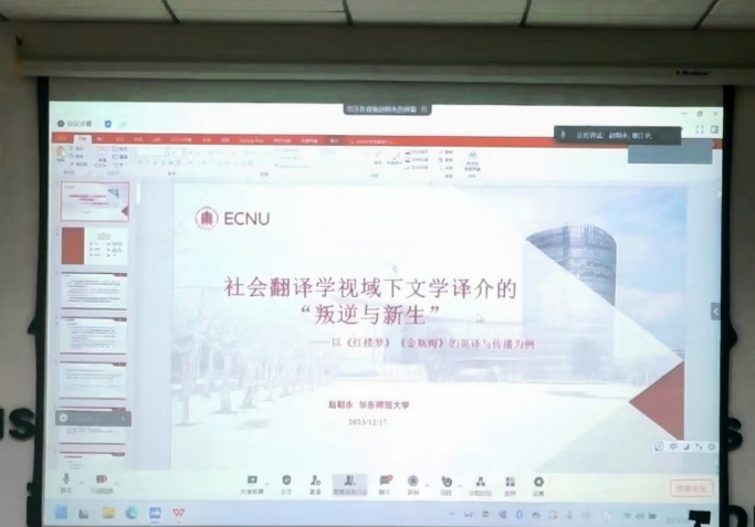 12月17日上午,“第3届外语跨学科研究南湖学术论坛暨第8届研究生学术年会”在tyc122cc太阳成集团102会议室举行。华东师范大学赵朝永教授作“社会翻译学视域下文学译介的‘叛逆与新生’——以《红楼梦》《金瓶梅》的英译与传播为例”线上讲座。