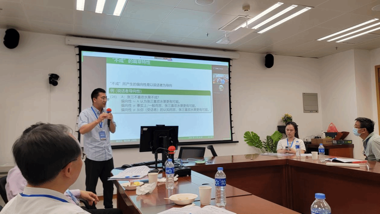 我院教师徐贝贝和耿云冬作为共同报告者受邀作题为“基于‘框式虚词’结构的句末助词‘不成’的句法语义分析”。基于邓思颖(2007,2008)对粤语中“咪……啰”等结构的句法分析,提出汉语中由不相连的前置副词和句末助词所组成的“难道/莫非……不成”也属于框式虚词结构的观点,引起与会者极大兴趣与讨论。广外石定栩教授、张庆文教授对本次报告做出了高度评价,香港中文大学邓盾副教授和肇庆医学院林晓燕老师则对报告中提到的“不成”单用的情况展开了讨论,他们的观点对优化论文后续写作提供了重要启发。徐贝贝老师还受邀主持了5月25日上午的两场主旨报告。