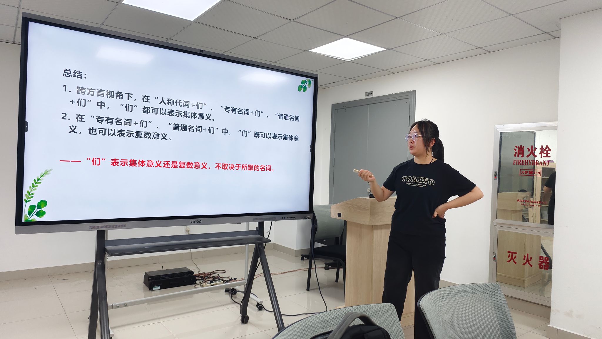 针对吴语方言研究,我院研究生谢梦羽同学分享了动词重叠与“看”联用现象的初步探索,其微观视角的研究切入点获导师组肯定。赵琛老师建议,跨语言研究中需强化例句标注规范,“应同步提供读音、字义及翻译,确保学术交流的准确性”;刘星老师则针对孙勃林的研究提出,后续可结合语料库分析与实验设计,增强结论的实证支撑。