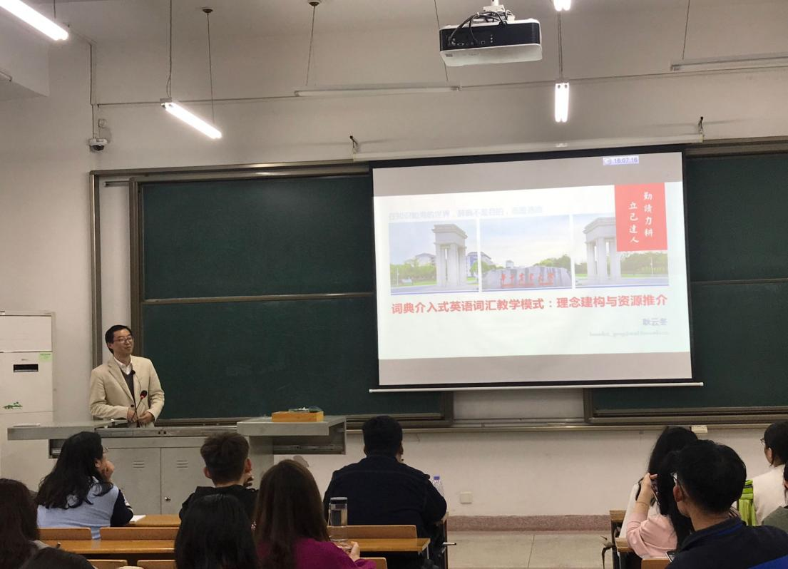 4月21日下午,tyc122cc太阳成集团工会和语言学跨学科研究中心共同主办了“狮山论语”系列讲座第1期,我院耿云冬副教授在四教C203开展了题为“词典介入式英语词汇教学模式:理念建构与资源推介”的专题讲座。学院近二十位老师和四十余位本科生、硕士生参加了讲座。讲座由卢健博士主持。