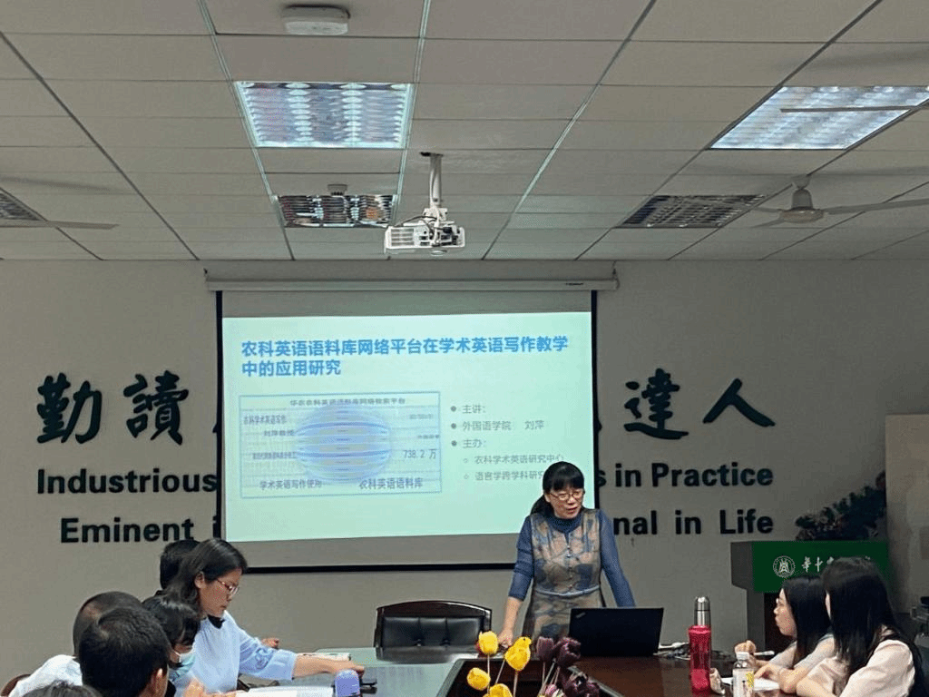 5月7日下午,人文社科楼附楼A102会议室座无虚席,我院刘萍教授为在场师生详细、生动地展示了农科英语语料库在学术英语教学及其研究中的应用。讲座由农科学术英语研究中心和语言学跨学科研究中心共同举办。刘座雄副教授主持讲座。