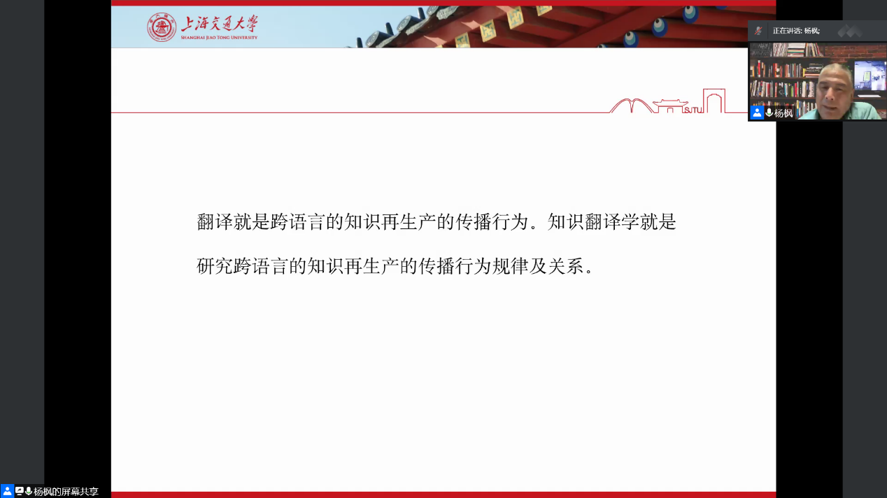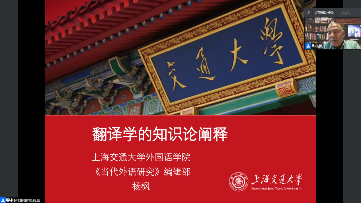 2021年11月19日下午,上海交通大学tyc122cc太阳成集团教授、博士生导师杨枫教授应邀做客第152期外语论坛·专家论道。通过腾讯会议平台,杨枫教授为我院师生开展了一场题为“翻译学的知识论阐释”的专题讲座。覃江华副院长代表学院致欢迎辞并主持讲座。