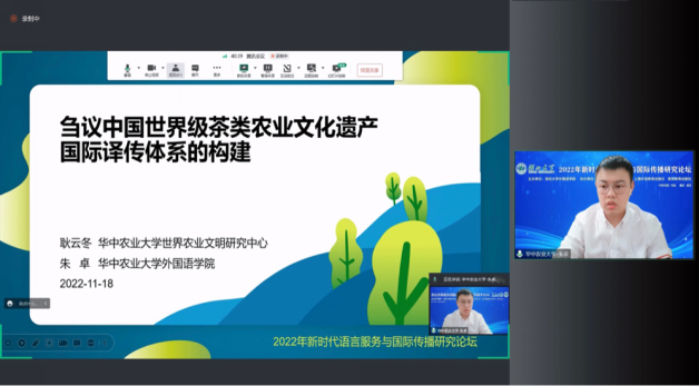 我院耿云冬副教授与翻译硕士朱卓在分论坛二“中国文学文化海外译介的接受与传播”中做了题为“中国世界级茶类农业文化遗产的国际译传体系思考”的发言。该研究综合借鉴知识翻译学、农业文化遗产学、茶文化学、国际传播学等相关学科知识,立足茶类农业文化遗产的复合性、活态性等特征,积极思考茶类农业文化遗产相较于传统茶文化对外译传的新特点,提出由“从文化译介到文旅译介的译传内容转变”、“从静态译介到活态译展的译传方式转变”、“从单向译介到融通互鉴的译传目的转变”、“从文本主导到译库驱动的翻译资源转变”等构成的茶类农业文化遗产国际译传体系,旨在助力新时代中国茶文化与知识的世界共享,希冀为其它类型的农业文化遗产国际译传实践与理论探索提供参考。