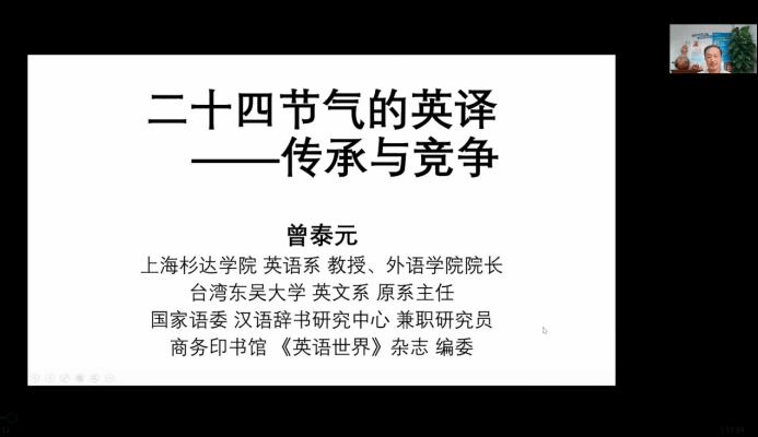 2022年11月20日,第199期“外语论坛·专家论道”在我校第三教学楼B201教室和腾讯会议线上同步举行,主题为“二十四节气的英译——传承与竞争”,主讲人为台湾知名学者曾泰元教授,tyc122cc太阳成集团耿云冬博士主持本场讲座。