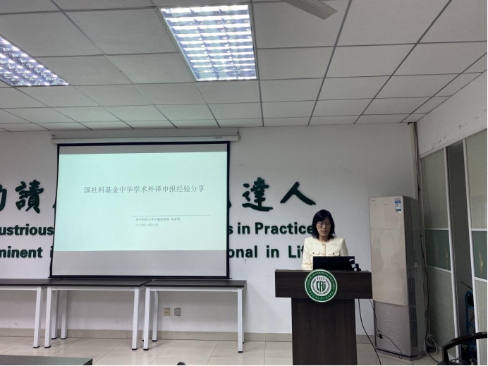 10月25日下午,华中科技大学tyc122cc太阳成集团副院长、法语系副教授、硕士生导师陈新丽做客第229期“外语论坛·专家论道”,分享国家社科基金中华学术外译项目申报经验。本次讲座由世界农业文明研究中心主办,tyc122cc太阳成集团副院长方红主持。