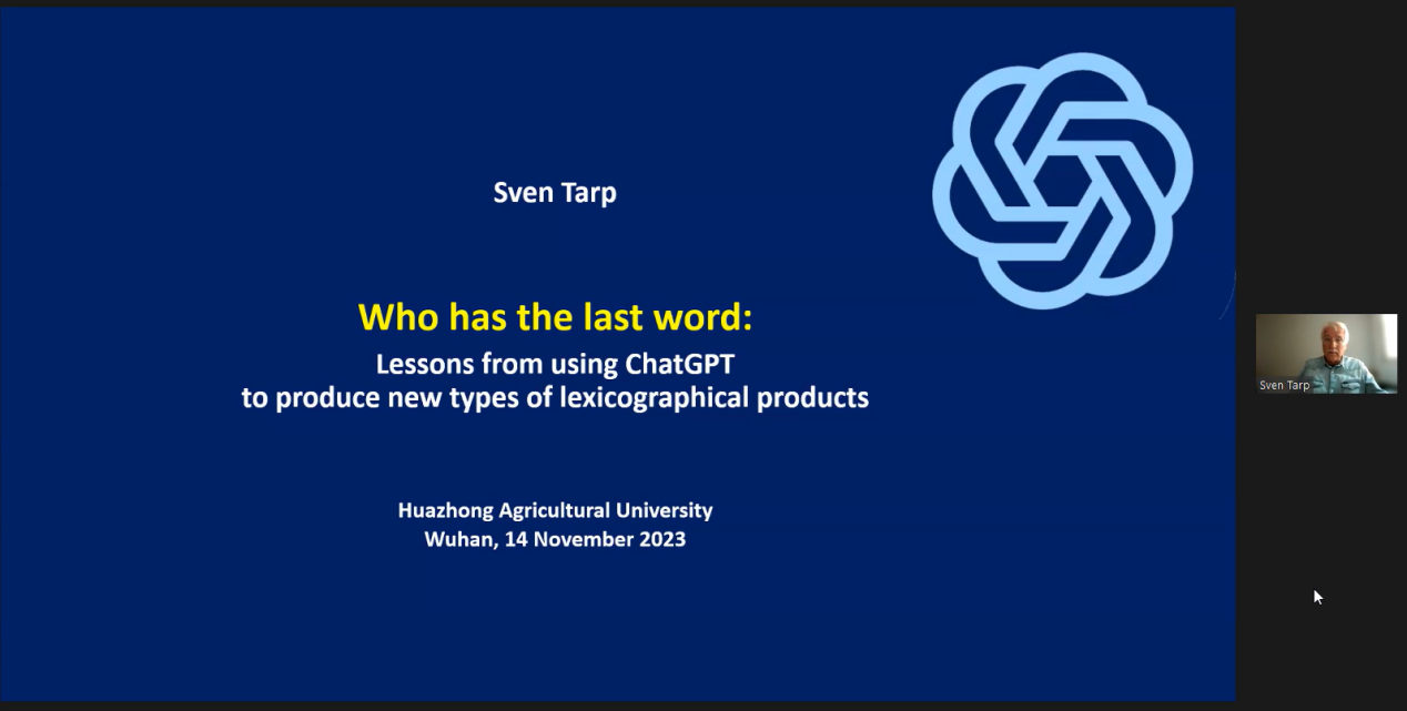 2023年11月14日晚,丹麦奥胡斯大学(University of Aarhus)教授、国际知名词典学者、现代功能词典学理论创始人Sven Tarp(斯宛·塔普)应邀做客第233期外语论坛·专家论道,为我院师生做了题为”Who has the last word? Lessons from using ChatGPT to produce new types of lexicographical products“(谁主沉浮?关于ChatGPT与词典编纂创新的思考)的线上讲座。本次讲座由tyc122cc太阳成集团语言学跨学科研究中心主办,耿云冬副教授主持。