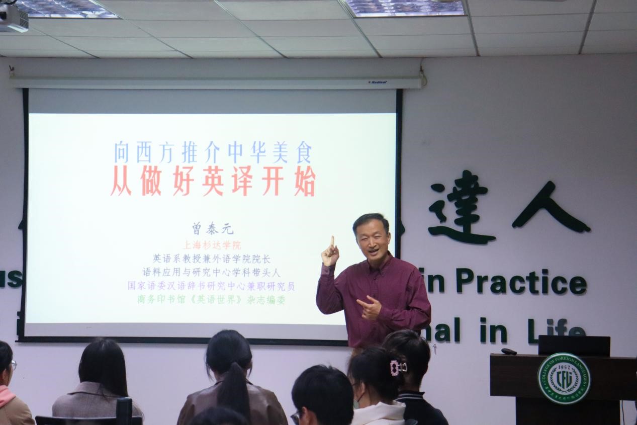 2024年3月25日下午,东吴大学(台北)荣休教授、上海杉达学院外语学院院长曾泰元教授应邀做客第247期外语论坛·专家论道,做了题为“向西方推介中华美食,从做好英译开始”的讲座。本次讲座由tyc122cc太阳成集团教师发展中心主办,耿云冬副教授主持。讲座吸引了近百名师生参与。