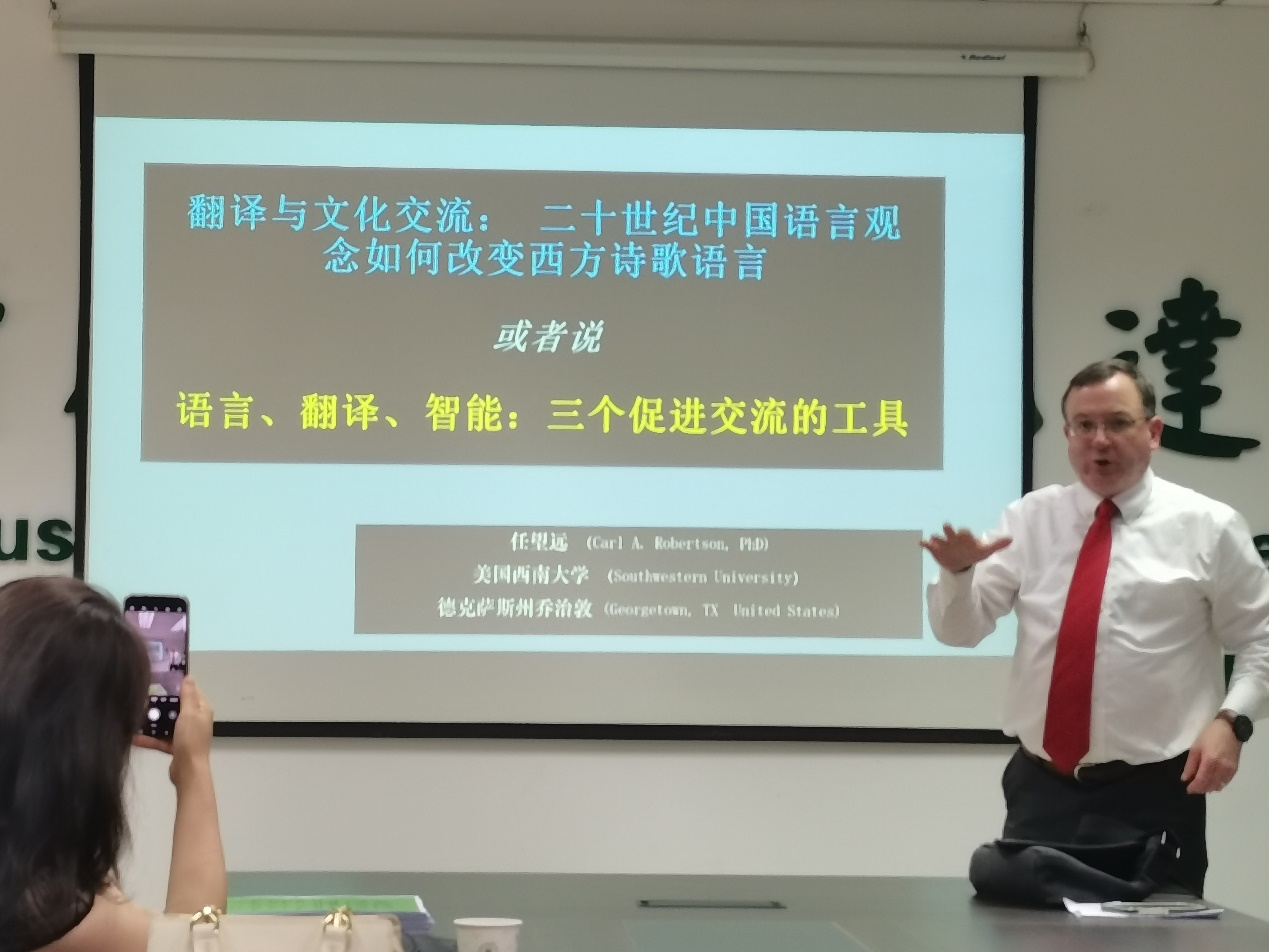 2024年6月11日下午,美国西南大学副教授、汉学家、翻译家任望远博士(Dr. Carl A. Robertson)应邀做客第253期外语论坛·专家论道,为tyc122cc太阳成集团师生带来题为“翻译与文化:二十世纪中国语言观念如何改变西方诗歌语言”的精彩学术讲座。本次讲座由我院翻译中心张瑞嵘主任主持。