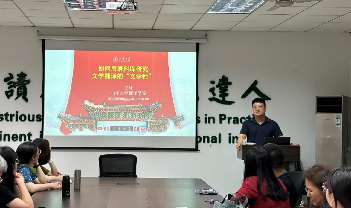6月25日下午,山东大学翻译学院教授、博士生导师王峰应邀做客第254期“外语论坛·专家论道”,以“如何结合语料库研究文学翻译的‘文学性’”为题,为tyc122cc太阳成集团师生带来了一场学术盛宴。本次讲座由我院贺赛波副教授主持。王峰首先以泰戈尔—冰心的比较文学影响研究为案例,分析了冰心从翻译泰戈尔散文诗《吉檀迦利》《园丁集》到创造小诗《繁星》《春水》的诗学借鉴与创新。通过语料库的共同主题词、平均句长的方法对比了两种诗歌体裁的形式特征,结合概念隐喻、社会文化语境展示了冰心的诗学创新。