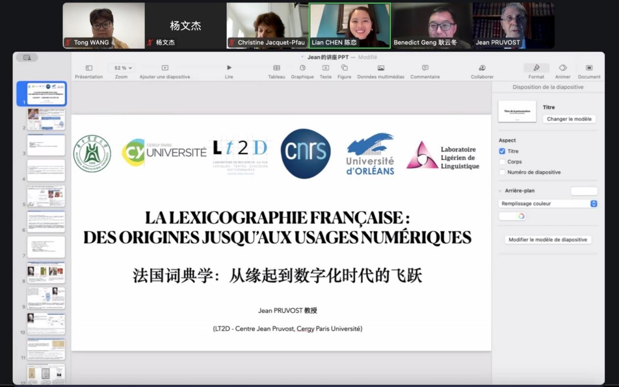 2024年11月8日下午16:30-18:30,法国塞尔吉-蓬图瓦兹大学(Université de Cergy-Pontoise)名誉教授、著名词典学专家Jean Pruvost受我院邀请,以“法国词典学:从缘起到数字化时代的飞跃”为题做了一场精彩的线上讲座。本次讲座通过Zoom平台进行,吸引了众多词典学、语言学及相关领域的中外学者和学生,共同探讨词典学的过去、现在及未来。本次讲座受科技部外专项目资助,我院副院长耿云冬为本次讲座召集人,法国赛尔吉-巴黎大学(CY Cergy Paris Université)陈恋副教授受邀担任讲座主持人。