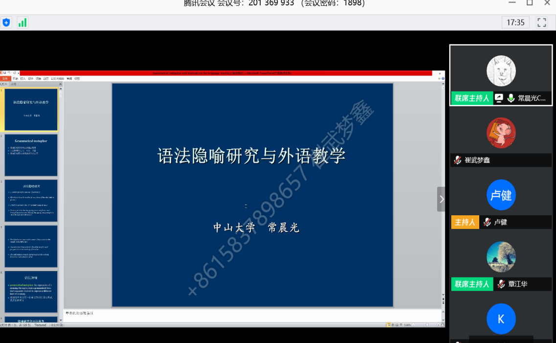 2020年5月20日下午,中山大学常晨光教授应tyc122cc太阳成集团邀请,在线开展了题为“语法隐喻研究与外语教学”的学术讲座。讲座受到广泛关注,来自我院和全国其他高校的约三百名师生与会聆听。覃江华副院长代表学院致欢迎辞,卢健博士主持讲座。