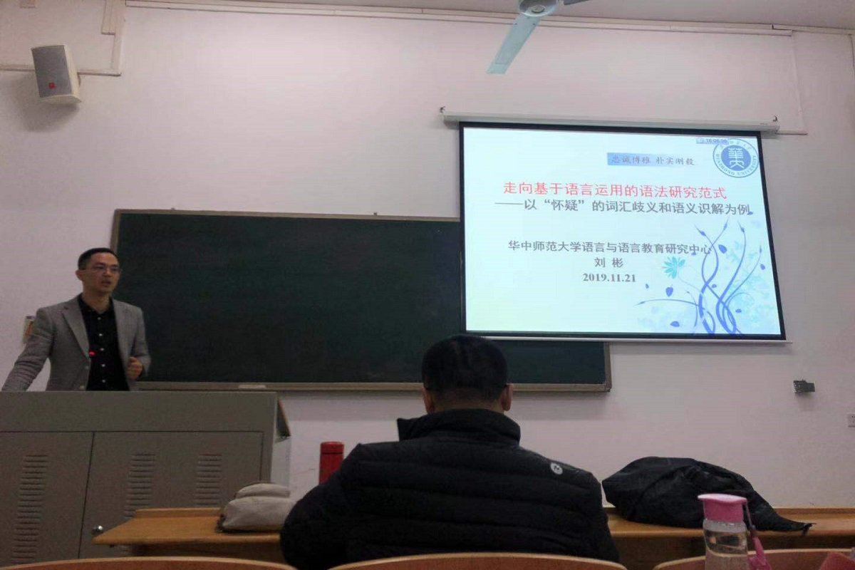 11月21日下午4点,华中师范大学语言与语言教育研究中心刘彬讲师坐客我校,在一教105室为tyc122cc太阳成集团师生开展了“走向基于语言运用的语法研究范式--以“怀疑”的词汇歧义和语义识解为例”主题讲座。