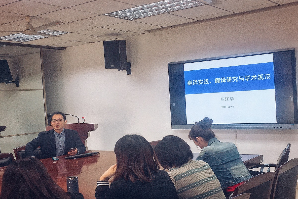 11月8号上午10点,覃江华副教授在人文楼附楼二楼A201会议室为大家带来了一场题为“翻译实践、翻译研究与学术规范”的讲座。学院19级全体研究生到场聆听学习。