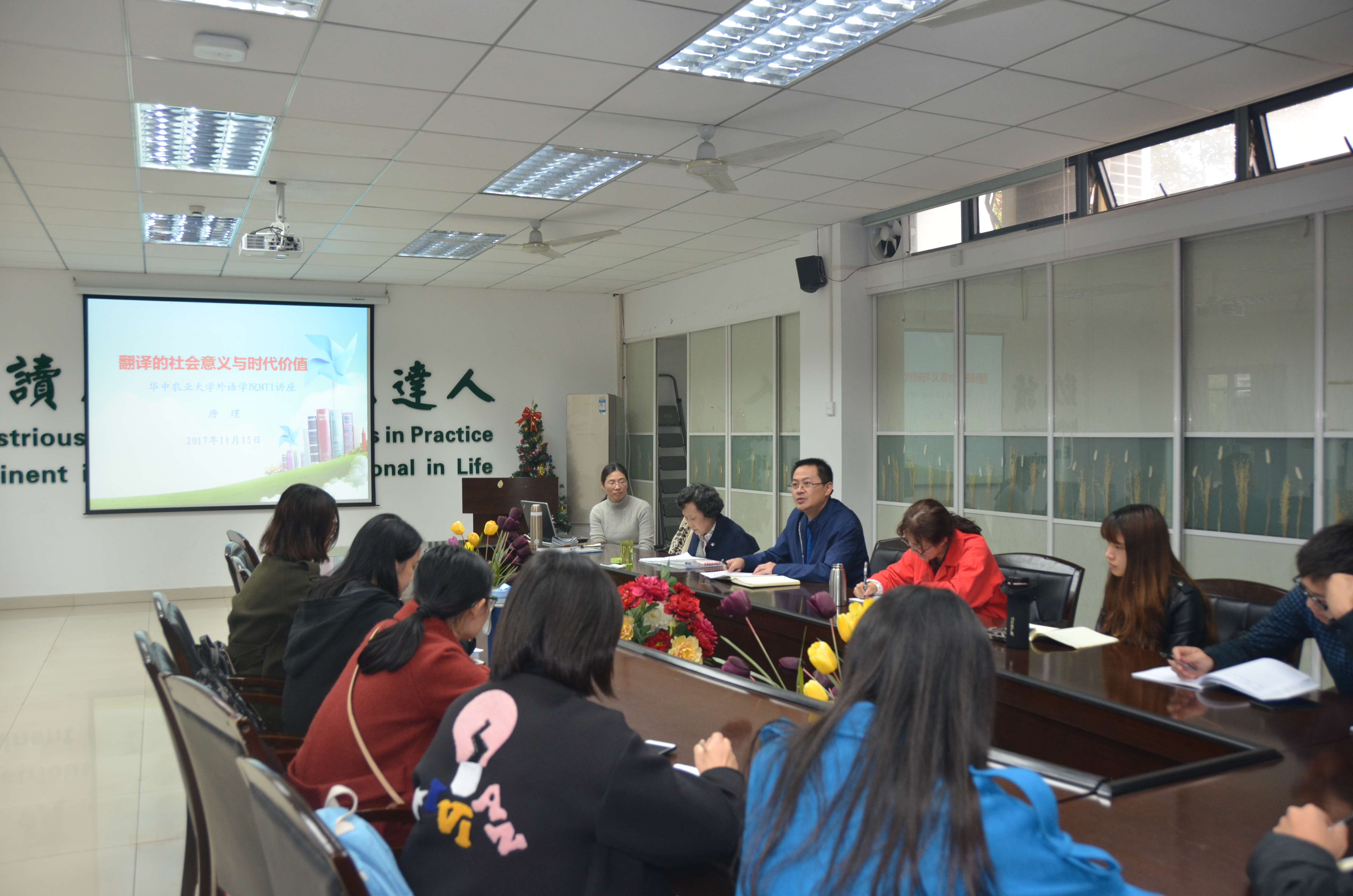 11月15日下午4:00,全国政协委员、民进湖北省委副主委、太阳成集团tyc122ccvipMTI校外导师唐瑾老师莅临我院,为我院师生带来一场题为《翻译的社会意义与时代价值》的讲座。院长姚孝军教授到会致欢迎辞,tyc122cc太阳成集团翻译与文化研究中心主任、MTI教育中心主任曾文华主持,龚献静、卢志君、刘玉芹等tyc122cc太阳成集团教师及2017级MTI研究生参加了本次讲座。