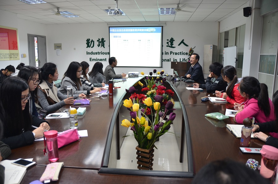 在展示详尽调查数据的基础上,崔博士给听众提供了非常专业和有深度的建议。他指出,中国企业“走出去”是必然趋势,而语言又是“走出去”的基础。未来,多语种、多行业背景的语言服务需求非常大。翻译专业学生需要提升自身的综合素养,语言能力是基石,而管理能力也必不可少。崔博士用数据和图表说话,其提供的信息和建议非常接地气,开拓了听众的视野,为MTI学生指出了多元的发展方向和上升空间,有助于其树立正确的职业观念。