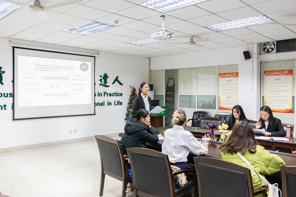 在介绍辩论规则与辩题后,植物科学技术学院与资源与环境学院辩手率先开赛,双方以“This house would ban the detailing of criminal cases (for example, the description, picture or video of how the criminal killed the victim)”为题展开了激烈辩论。正方植物科学技术学院辩手从公布刑事案件细节带来的负面影响论起,认为“过于血腥暴力的细节会给阅读者留下心理阴影,而媒体对于案件细节的断章取义可能会给受害者造成二次伤害”。反方资源与环境学院则认为,公布案件细节可以更好地维护社会安定,其理由是案件细节的公开可以帮助还原真实案件,避免公众的无端猜测及社会恐慌,同时也可以提高人们的自我保护意识及法律意识,减少此类案件的再次发生。