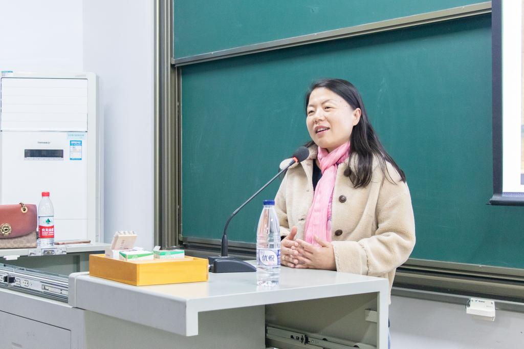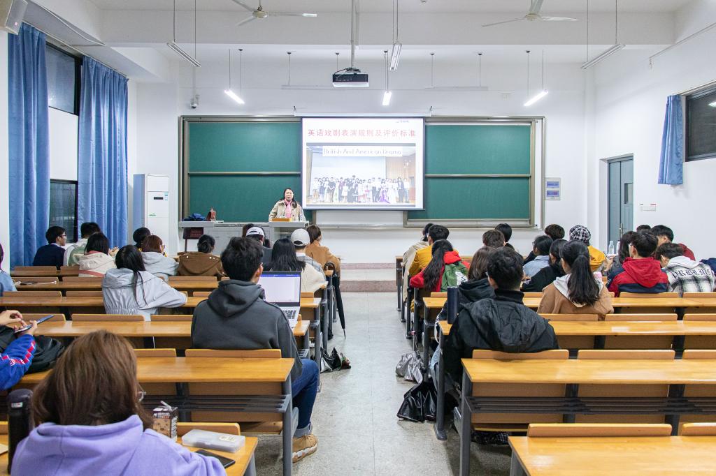 随后,方红就亚里士多德戏剧理论“三一律”进行了详细讲解,通过分析往届学生在戏剧表演中出现的问题,具体地阐释了何为“时间的一致、“行动的一致”及“地点的一致”。她强调,表演过程中,应注意细节对于戏剧效果的影响,如参演人数应服从剧情的要求,演员在表演过程中不应背对观众且站位要明确,配角应选用适当的方法积极参与表演等。在现场提问答疑环节,同学们积极与老师进行互动,大家对英文话剧比赛有了更深入的了解,也极大增强了比赛自信心。方红最后寄语大家:“在备赛时间有限的情况下,希望各院参赛选手能够做好充分的准备,展现出最佳风采。”