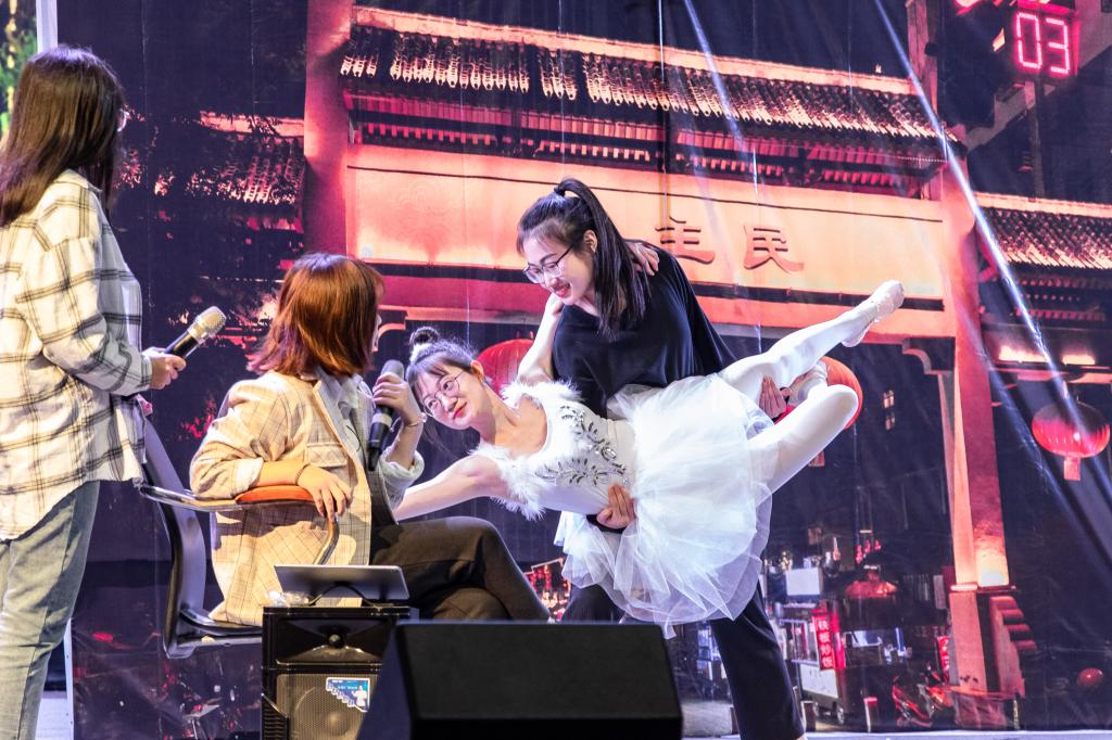 一曲《温柔》拉开了整场晚会的序幕,工学院文艺部男生们的嗓音低沉浑厚,充满磁性,让听众无不陷入那一抹深情的温柔。随后,外院Double F舞团带来活力四射的舞台串烧,台风炫酷,节奏律动,舞团成员的身体里迸发出巨大的能量,燃爆全场。而之后外院和工学院同学合唱的《手心的蔷薇》又在梦幻中向现场观众展现出青春的懵懂和美好。如何才能吸引观众的注意力?外院镜灵剧社的话剧《收视登顶》给出了一个精彩的答案。激烈尖锐的人物矛盾和出乎意料的反转剧情为观众带来全新的观感体验,现场笑声不断,喜剧氛围达到高潮。