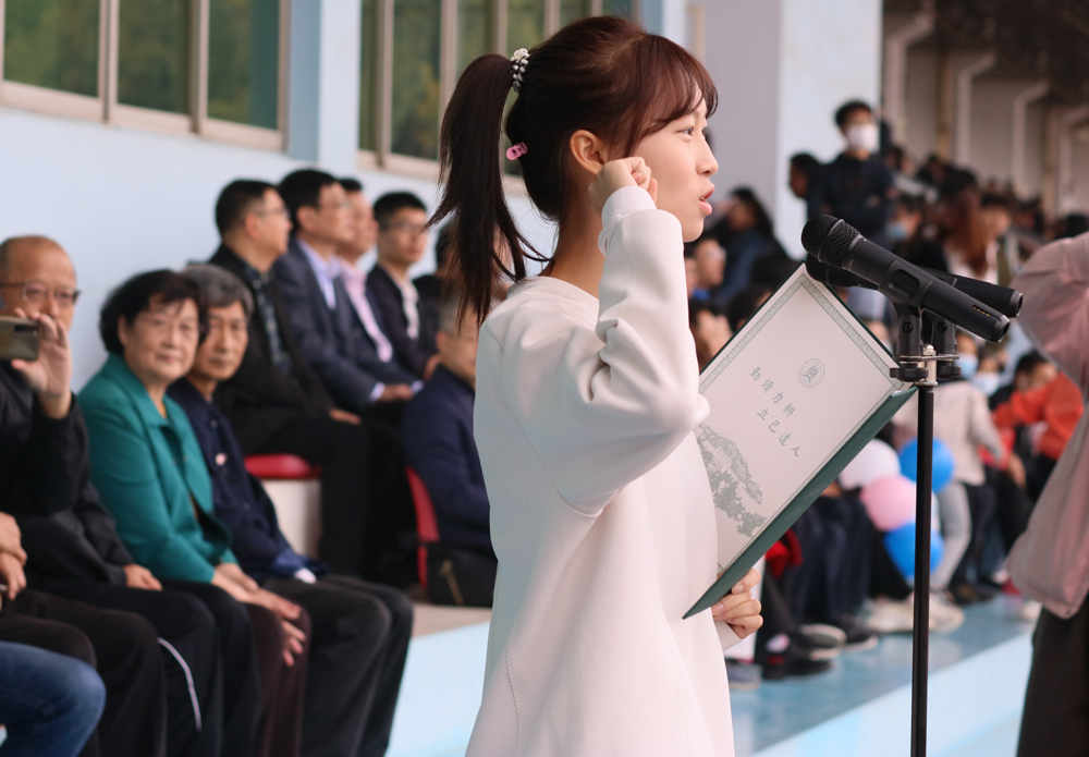 待全部方队入场完毕,大会举行庄严的升国旗仪式。运动场内,全体师生肃立,向国旗行注目礼,齐唱国歌。而后,运动员代表张芷培与裁判员代表郑重宣誓,现场再次响起热烈的掌声,共同欢庆运动会的开幕。