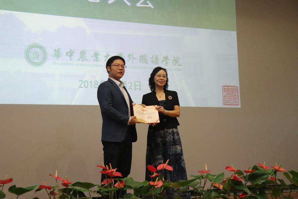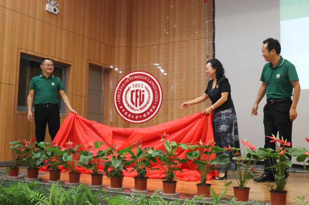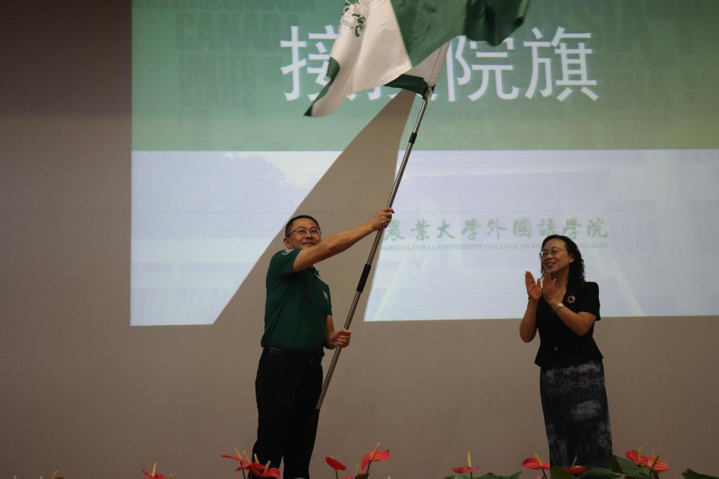 随后,学院正式发布院训、院徽、院旗。“兼蓄中外”要求全院师生博学多闻、开放包容,正确认识“中国特色,国际比较”,发出中国声音。“善思笃行”鼓励全院师生勤于思考,知行合一,努力做到“勤读力耕,立己达人”,传承校训精神。院徽以红色为主基调,整体为圆形,以地球为背景,中间融合tyc122cc太阳成集团英文简称“CFL”设计变形为盾牌形状,体现出“学贯中外”的教育理念。中间融合稻穗,寓意华农外院立足农大根本,传承校训精神,师生勤劳朴实,知行合一。阿拉伯数字“1952”为学院前身华中农学院外语教研室设立之时。院旗包含华农校徽和外院院徽及中英文名等设计元素,采用大面积华农绿作为底色,寓意全院师生“积极向上,生机盎然”。吴平副校长和姚孝军院长上台共同揭布院训、院徽,并向外院授院旗。