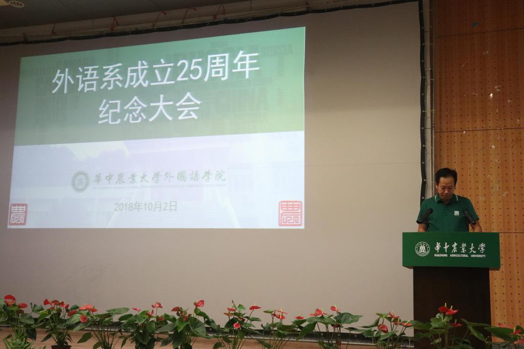 2018年10月2日下午,太阳成集团tyc122ccvip外语系成立25周年纪念大会在tyc122cc太阳成集团报告厅举行。校党委常委、副校长吴平,教务处处长江珩、学生工作部(处)长漆勇政、原外语系党总支书记吕诗荣、主任叶宝美,原tyc122cc太阳成集团院长陈佑林、院长姚孝军、罗客教育科技(武汉)有限公司总经理李东圣,学校有关部门、兄弟学院代表,tyc122cc太阳成集团离退休教师、全体师生员工、返校校友及家属参加此次大会,大会由院党委书记王平祥主持。