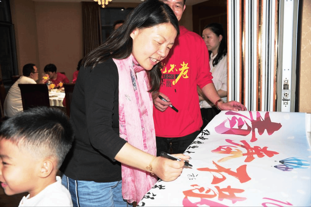 晚餐就定在校内的国际学术交流中心,这次聚会本没想惊动学院领导,只邀请了班主任方红老师,但没料到的是,因为今年正值华农120周年校庆,也是外语系成立25周年,学院领导对校友们的回校重聚很是重视。正当大家围桌而坐、促膝而谈的时候,领导们牺牲周末的休息时间,来跟大家短暂会面,院党委王平祥书记、MTI中心主任曾文华副教授跟大家聚集在一起拍照留念,并在特别为聚会制作的横幅上签字。至此,掀起了聚会的另一个高潮。