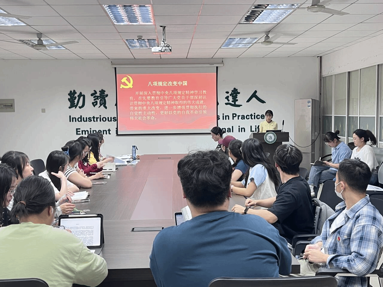 在交流研讨环节,党员同志们纷纷结合自身实际分享学习感悟。刘菲同志表示将以中央八项规定精神为指引,坚持严谨治学,避免学术不端;并以调研精神开展学术研究,让成果服务于实际。王统同志分享了自己参与乡村调研的经历,表示要发挥外语专业优势,增强个人能力,在科研中服务社会、在实践中架好祖国与世界沟通的桥梁。