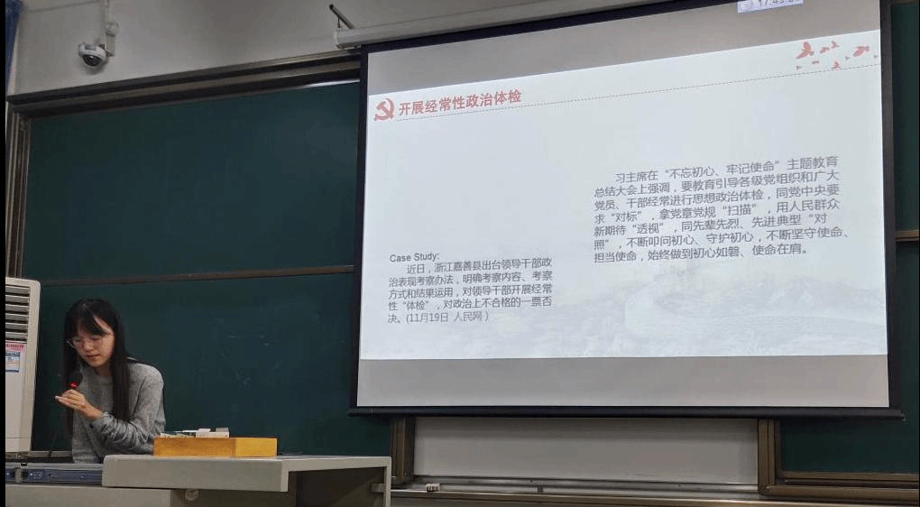 英语本科生第一党支部在系统学习党史、新中国史、改革开放史和社会主义发展史后,共同学习了合格党员标准,并现场开展了学习强国最新专项知识答题。李雨桐同志在学习中认为,党的执政政策在实践中不断更新完善,但“为人民服务”的初心和使命始终没变,捍卫国家和人民的利益的决心始终没变,我们作为一名青年党员也要时刻牢记为同学们服务的初心,并坚持终身学习,提高自身本领,继续用实践践行使命,争做合格党员。英语本科生第二党支部重点学习了《意见》,支部同志一致认为作为党员我们应自觉打扫思想灰尘,不断增强政治免疫力,始终坚持以人民为中心,反对形式主义、官僚主义,用足用好批评和自我批评武器。孙艺妍表示,坚持以人民为中心,是新时代中国共产党不忘初心、牢记使命的思想起点,并结合实际学习、生活、工作谈了感受。此外,支部结合学习内容就“反腐败”“社会主义市场经济体制”等进行了中英互译。