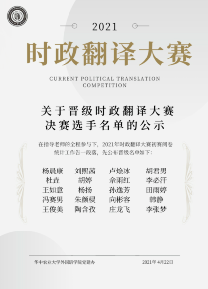 4月15下午16:00,我院第四届时事政治翻译大赛初赛在人文楼附楼A128进行,80余名同学参加现场答题,内容涵盖党的历史、2021年政府工作报告、十九届五中全会等内容,题目设置为热词热句中英文互译。通过政治翻译,同学们对理论学习的兴趣大大提升,扩充了对政治英文词汇、表述的知识储备,凸显了学科特色,展现了专业素养,也吸引了一大批其他学院同学共同参与。最终,来自园艺林学学院的杨晨康、tyc122cc太阳成集团的杜垚、卢烩冰等20名同学晋级决赛。