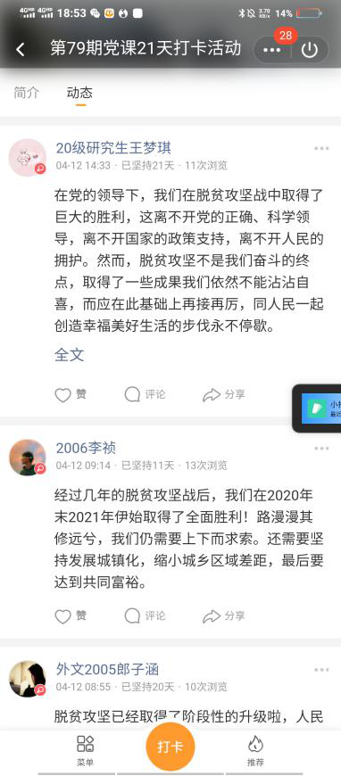 入党积极分子处在入党的第一关,作为第一关的“把门人”,学院党校通过本次活动,帮助入党积极分子树立了主动学习、主动思考理论知识的良好习惯,学员们不仅学到了理论知识,也提高了个人的思考、判断、分析能力。活动结束后,外文2007班杜骞同学谈到:“通过每日打卡活动,我不仅加强了自身对党的认识,又提高了自己对于党的方针、政策的理解,提高了自己的分析能力,一举两得”。