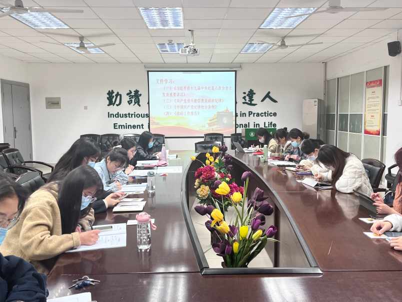 首先,组织委员霍明慧领学《习近平在习近平在十九届中央纪委六次全会上发表重要讲话》,对该文件主要内容进行了梳理,并对其重点进行详细讲解,她表示,党的十八大以来,全面从严治党取得了历史性、开创性成就,正是因为我党不断推进党风廉政建设和反腐败斗争。随后宣传委员王怡带领全体党员学习《共产党员不能信教是政治纪律》,并表示此项政治纪律是我们党区别于其他政党的一大特点。该文件从马克思主义理论角度出发,对党员不能信教的原因进行了全面诠释,通过对该文件的学习,全体党员受益颇多。之后纪检委员廖伊荟带领全体党员研读《中国共产党纪律处分条例》,并表示党员应当时刻将纪律铭记于心,严格要求自己。最后支部书记李玲霞带领全体党员对《政府工作报告》进行了简要回顾,她认为应当将理论与专业特色相结合,例如全体党员可对中英文版《政府工作报告》进行研读,不仅能够增强理论修养,又可扩充专业知识学习。