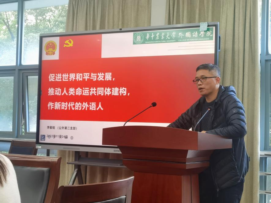 11月24日下午,公共外语教学部教工第二党支部与商务英语本科生第一党支部在人文楼M327联合开展11月主题党日活动。会议由公共外语教学部教工第二党支部书记王英振主持,以“师生互动、辅学研讨”的形式进行领悟分享,共话党的二十大精神。