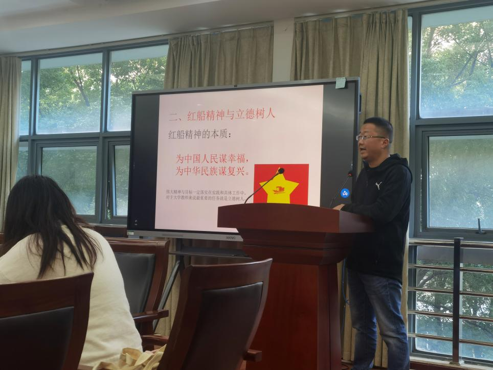 张瑞嵘同志结合教学工作经历,以“红船精神”的具体内涵、核心价值为切口,探讨如何在二十大的崭新征程中坚守初心,贯彻立德树人、言传身教的教育理念。他指出,新时代是奋斗者的时代,党员应发扬革命精神,在中华民族伟大复兴的历史使命中贡献自我力量。