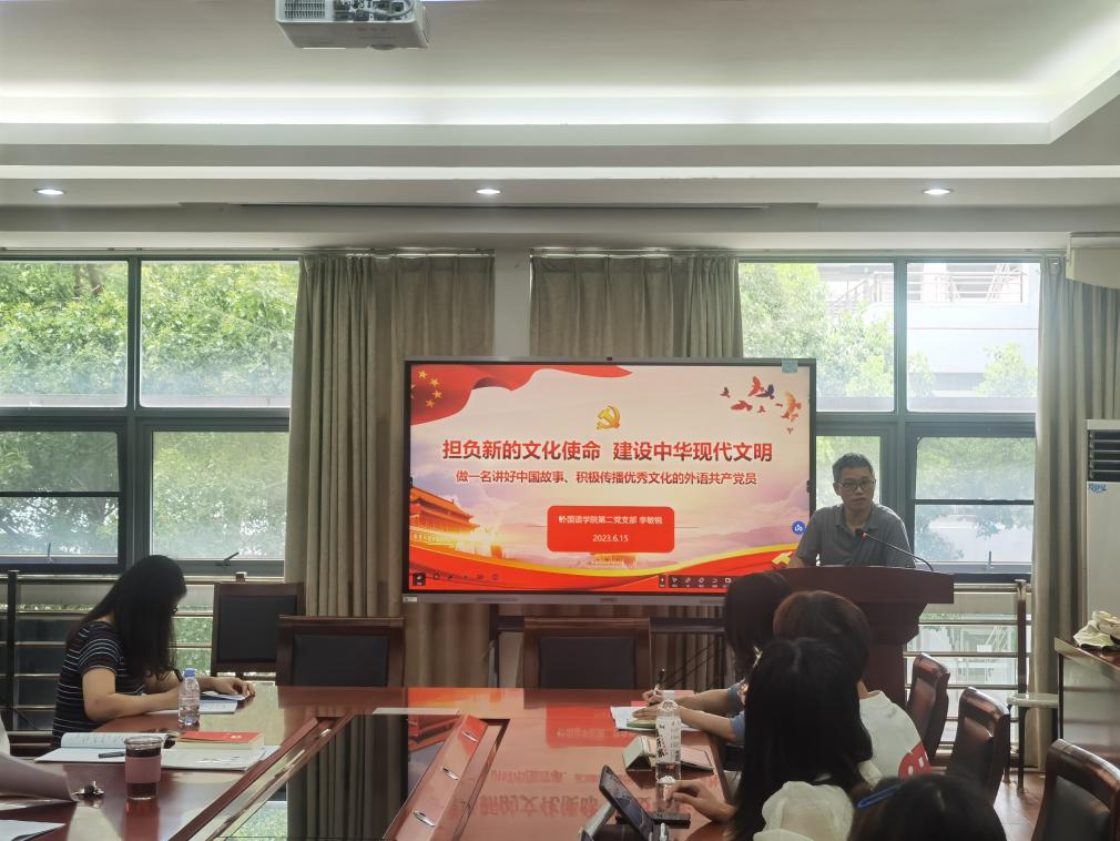 会上,公外教工第二党支部李敏锐同志以“担负新的文化使命,建设中华现代文明”为主题,结合中英翻译视角,形象阐述了习总书记在文化传承发展座谈会重要讲话中所强调的几个重要概念。李敏锐认为,习总书记的重要讲话具有极强的政治性、思想性、战略性、指导性,新时代外语工作者应担负起文化使命,做一名讲好中国故事、积极传播优秀文化的外语共产党员。