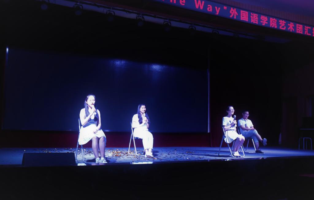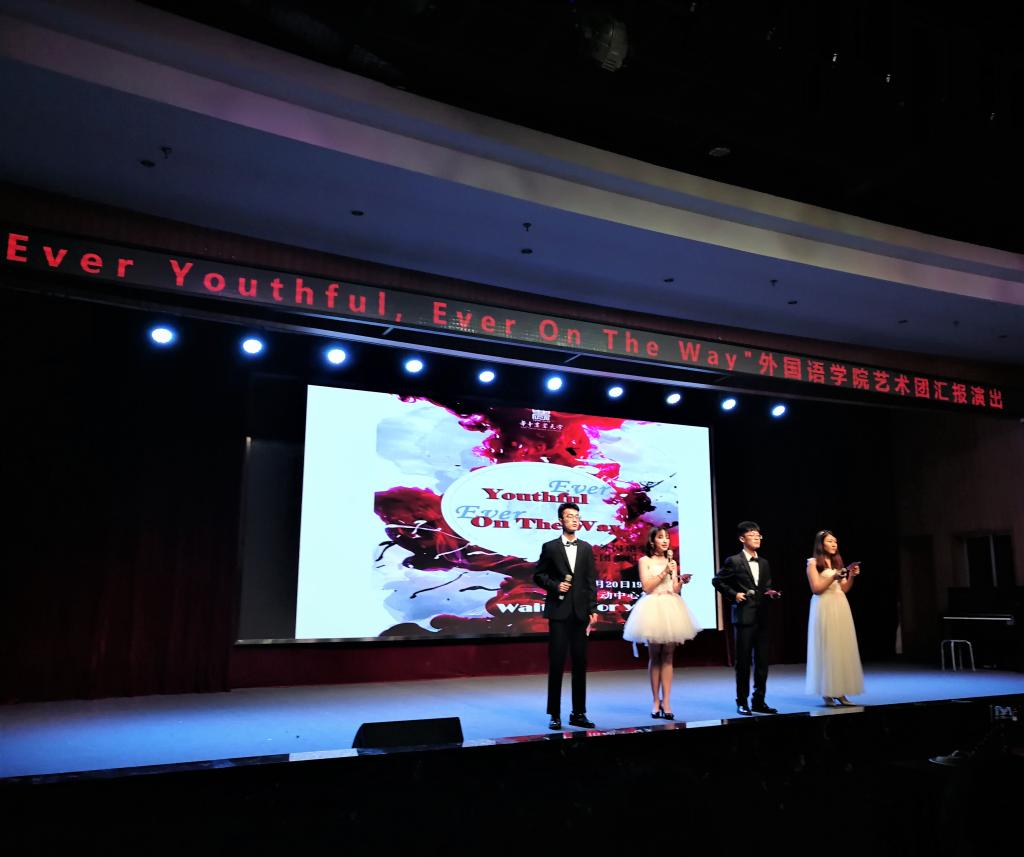 之后,宗星辰和辛媛媛演唱了流行歌曲《Always Online》和《当你》,她们用心展现,带来了一场堪称完美的表演,台下的观众早已沉浸在她们的歌声当中。接下来,镜灵剧社表演了短剧《我愿意》,精彩的表演又一次获得了无数掌声。压轴节目是天空之城合唱团带来的大合唱《不忘初心》,合唱团成员们饱含深情,用悠扬的歌声诉说着自己对外院艺术团,对tyc122cc太阳成集团始终如一的热爱。