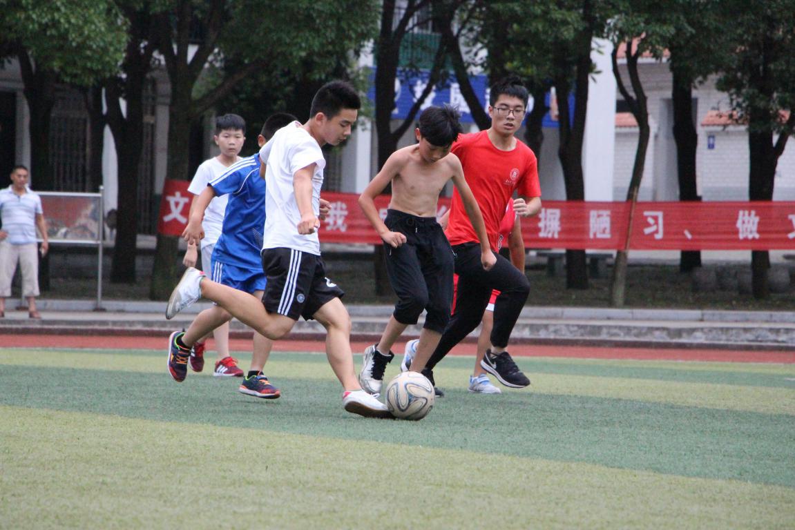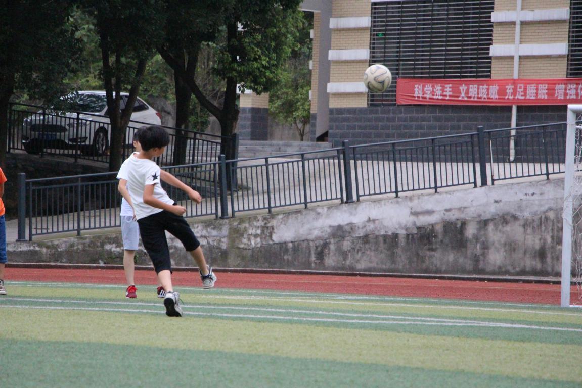 孩子们自信满满地站好自己的位置,前锋、中锋、后卫,守门员,裁判一吹口哨,运动员们就像发起冲锋似的向对方发起进攻。急停,转身,孩子们游刃有余地控制着球,球如同是孩子们身体的一部分;整个球场也因孩子们的奔跑而生机勃勃。炎热、汗水不能消磨孩子们的积极性;碰撞、跌倒不能拭去孩子们的神采奕奕。在孩子们激烈的比拼中,时间一点点消逝,不知不觉比赛接近尾声,这时子傲一个射门,将比分改写为三比三打平。
