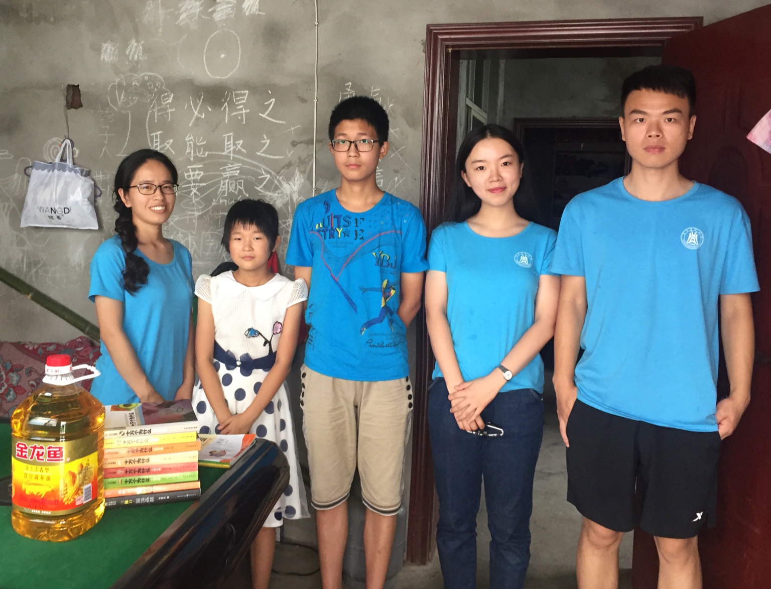 拿着一些书和本子,提着一桶油,队员庄玉蓉、盛锦悦、李泽星和丁梦丽四人来到六年级学生郭雄的家中。