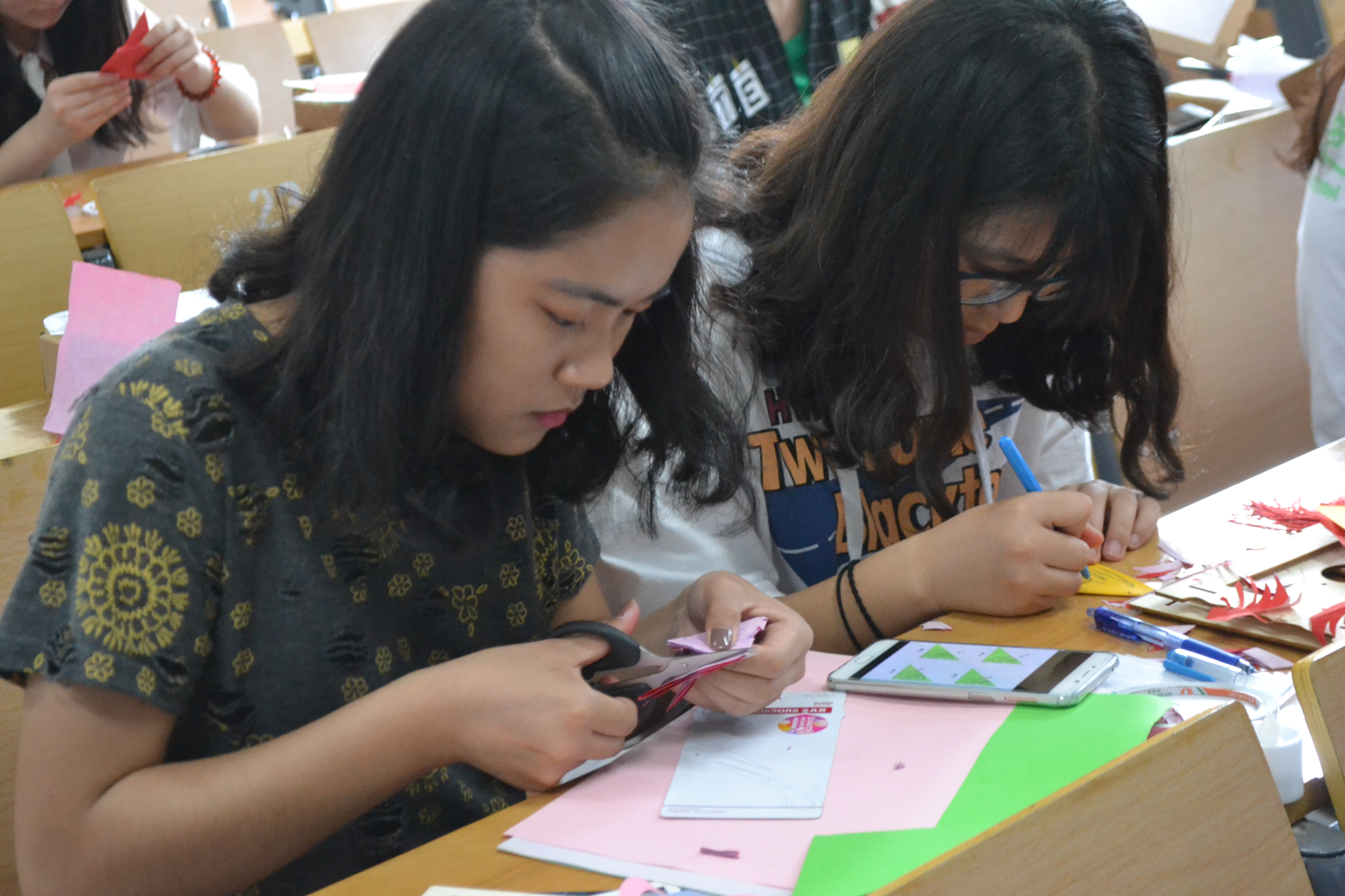 活动伊始,主持人何文田做开场介绍并向在场观众介绍了灯笼的历史由来与发展。随后,来自民俗民艺协会的黄海燕向同学们现场传授了剪纸教程,教授如何用折剪手法剪出雪花、蝴蝶等精美的图案,为后续制作灯笼做装饰准备。听完之后,同学们都拿起剪刀跃跃欲试。接下来,民俗民艺协会会长毛丽芳向在场同学介绍了制作灯笼的材料与其基本框架结构、拼接方法与最后的挂绳技巧。参与制作的同学两人一组。分组明确后,各小组成员集思广益,迅速拿出创意方案,然后投入到了灯笼制作的过程中。在这期间,来自民俗民艺协会的成员耐心指导各小组并给出建议。灯笼制作完毕后,活动进入猜灯谜环节。本次猜谜活动中,谜题范围广,涉及地名、字谜、人物名、成语名等,内容丰富多彩,融知识性与趣味性于一体。其中有些灯谜耐人寻味,难倒了不少同学,如字谜“一字十三点,难在如何点”、成语名“醉汉望天”等。本环节中,由孙浩东与陈浩组成的第九小组拔得头筹。接下来,各小组上台展示他们自己制作的灯笼并阐释其创意,然后由其他小组进行投票,选出最美灯笼。在这些色彩绚丽、新颖夺目的灯笼中不乏奇思妙想。第三组的吴金君同学在阐释中道:“我们在设计时想象着灯笼里住着一个漂亮姑娘,就在正面用彩纸流苏为她做了一道门帘,掀开后就可以看到用剪纸剪出的侧脸。另外,我们在背面贴了一簇手工的立体繁花,象征姑娘的美好结局。”投票结束后,由张利华、蔡玉组成的第四小组最终荣获冠军。她们的灯笼最大程度还原了原汁原味的宫灯。此外,她们在细节上也下足了功夫,如用格纹胶带纸制造出镂空的效果,颇具古色。