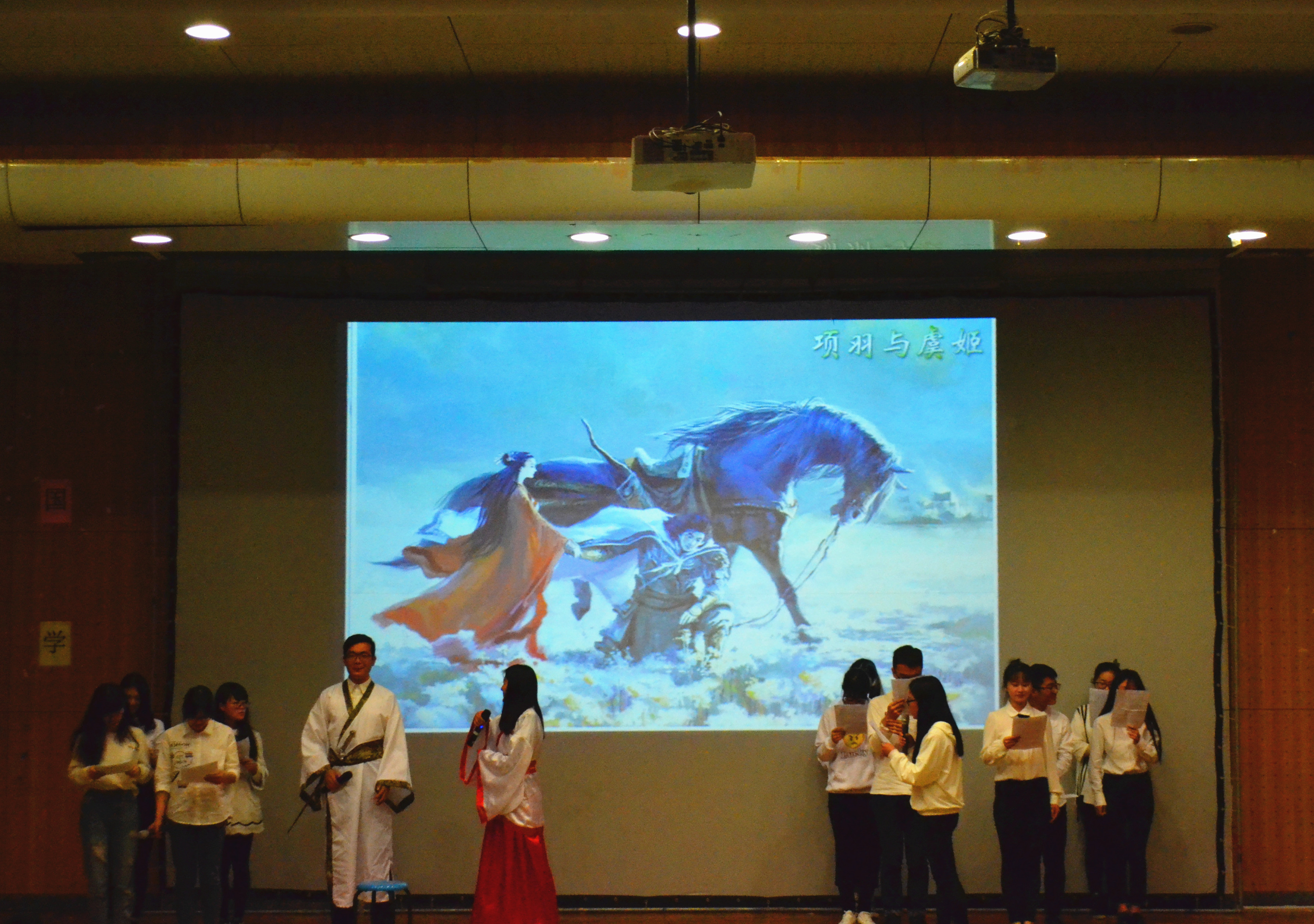 第一个节目是英语1601班的手影操和荧光舞。他们上台之前,灯光突然全部熄灭,引起了台下同学们的好奇。接着,英语1601班的同学们戴着荧光手套走上台,背景音乐《Dream It Possible》响起,十余名同学将双手拼成了飞鸟状,并随着音乐的律动缓缓聚集成一颗爱心。之后,部分同学用双手和印有党徽、团徽的荧光板组成了两个舞动着的小人,其余同学则举起了印有校训的荧光板站在台前,突出了表演的主题。展示完“千手观音”后,他们又表演了炫酷的荧光舞,令观者大呼过瘾。商务英语1603班表演了话剧《四川好人》选段。演员们身着戏服,演得有模有样,观众们看得也是津津有味。商务英语1601班带同学们回顾历史,表演了《乌骓别霸王》。该节目将朗诵与表演巧妙融合在一起:舞台两旁的同学们感情充沛地念着旁白;舞台中央的两位同学身着古装,演绎了项羽在四面楚歌之际与虞姬的生死别离。他们的表演极具感染力,使台下的同学身临其境。而英语1602班表演的舞台剧又将同学们的思绪拉回现实。该剧演绎了大学生活的几个片段:学习生活、纯真的校园爱情和感人的毕业之际,引起了台下观众的共鸣。