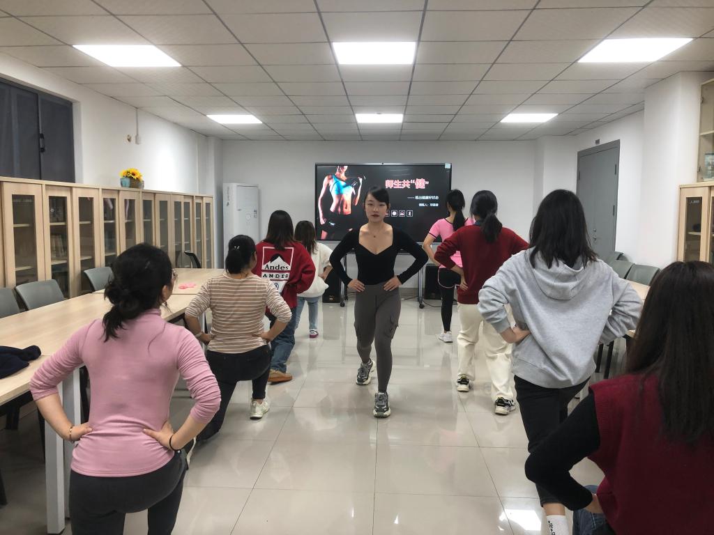 “第一个动作——深蹲,”邓语香同学边为大家演示边描绘动作,“双脚分开,与肩同宽。收紧核心,双手屈肘放于胸前。下蹲时注意膝盖不要超过脚尖,配合呼吸。”认真看完演示后,老师和同学们纷纷开始行动起来。起初毫不费力,可随着后续运动的进行,箭步蹲、螃蟹走、髋骨外展……大家的鼻尖、额头、后背悄然钻出了汗珠,双腿也开始发酸、变紧甚至发抖,但是脸上却始终洋溢着运动的快乐。经过“漫长”的训练之后,终于,在节奏明快的音乐声中,这场痛并快乐的运动迎来了最后的拉伸环节,下肢肌肉充分舒展放松,在酸痛交织中“获得新生”。