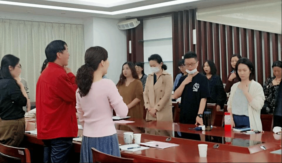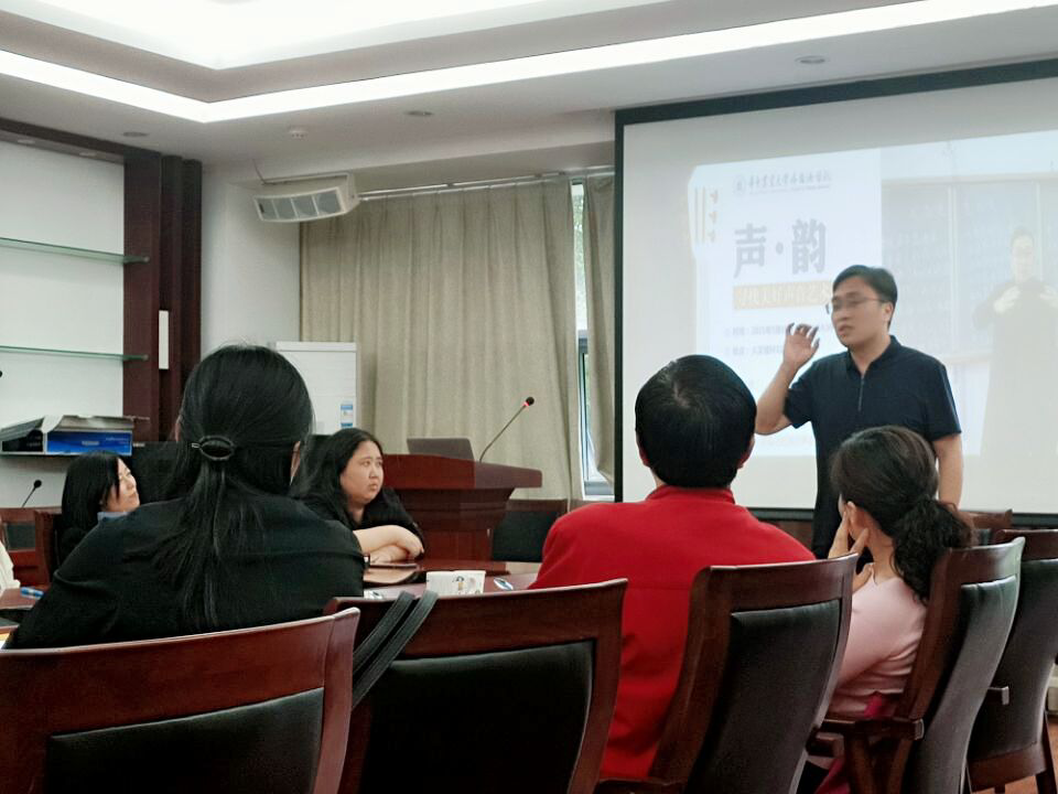 沈希飞老师由5月18日中央歌剧院在我校的演出作为引入,说明正确、科学的发声讲话方式在保护嗓子方面的重要性。沈老师的分享首先从“音调”开始。在沈老师的引导下,老师们共同起音阶,感受正确的发声位置。之后,沈老师以“山河伟大”四字的调值为例,提出“要将每个字的调值、声调说到位”,并选取一段小品台词作为练习,帮助老师们纠正音调与调值。在王英振老师、汪晓燕老师朗读过后,沈老师对她们的朗诵做了细致分析,指出在发音方面的问题。