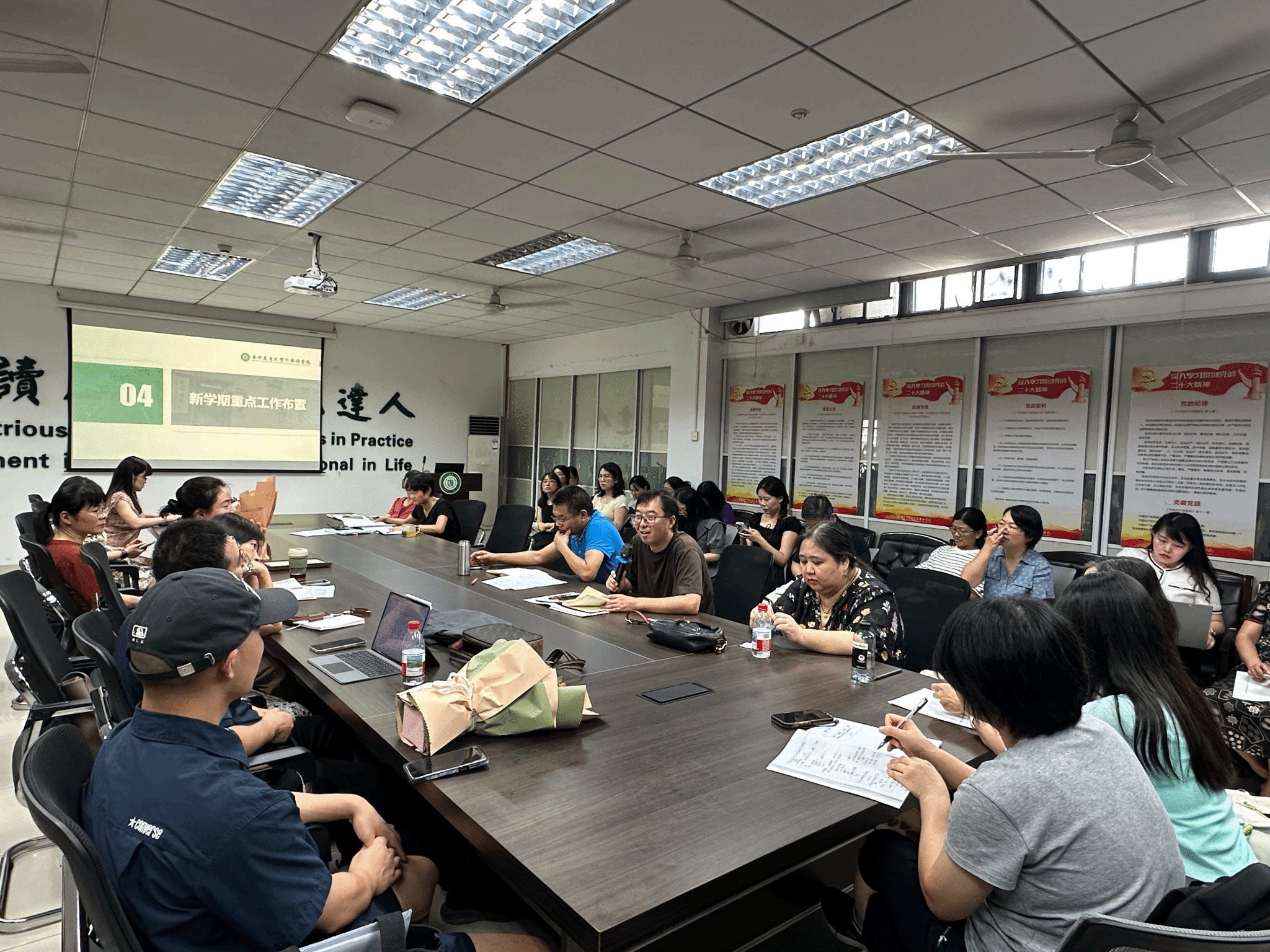 冯国林在总结讲话中对新学期工作提出四点要求。一是明确学院领导班子分工调整,确保各项工作有序衔接、高效推进;二是全体教职工要高度重视、主动参与本科教育教学审核评估迎评创建工作;三是倡导教师积极承担公共事务,增强集体意识,凝聚团队合力;四是切实加强安全教育,重点防范电信诈骗等风险,全力保障师生生命与财产安全。