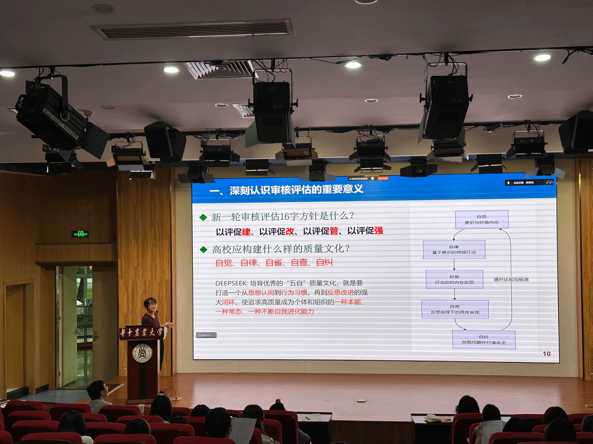 副院长秦发兰以“全力以赴高质量完成审核评估工作”为题,围绕审核评估的重要意义,学校教育教学理念、举措和成效,高质量完成审核评估三个方面进行了详细的汇报。秦发兰强调,本次评估是对学校整体办学实力的全面检阅,更是深化本科教育教学改革、提升人才培养质量的关键举措,结果事关学校高质量发展大局和广大师生切身利益。评估以“对国家负责、为学校服务”为宗旨,需严格遵循“以评促建、以评促改、以评促管、以评促强”的16字方针,着力构建“自觉、自律、自省、自查、自纠”的“五自”质量文化,完成以全面落实立德树人根本任务、突出“以本为本”核心地位、以学生发展为本位等的核心工作目标。我校参加的第一类审核评估聚焦世界一流办学目标,重点考察建设世界一流大学所必备的质量保障能力及本科教育教学综合改革举措与成效,体现了学校以一流师资队伍和育人平台培养拔尖创新人才、服务国家重大战略需求的办学定位。为了高质量完成审核评估,秦发兰要求全体教职工深刻认识当前评估进入关键阶段的紧迫性,以问题为导向细化整改措施,确保各项准备工作落地见效,为顺利通过评估奠定坚实基础。