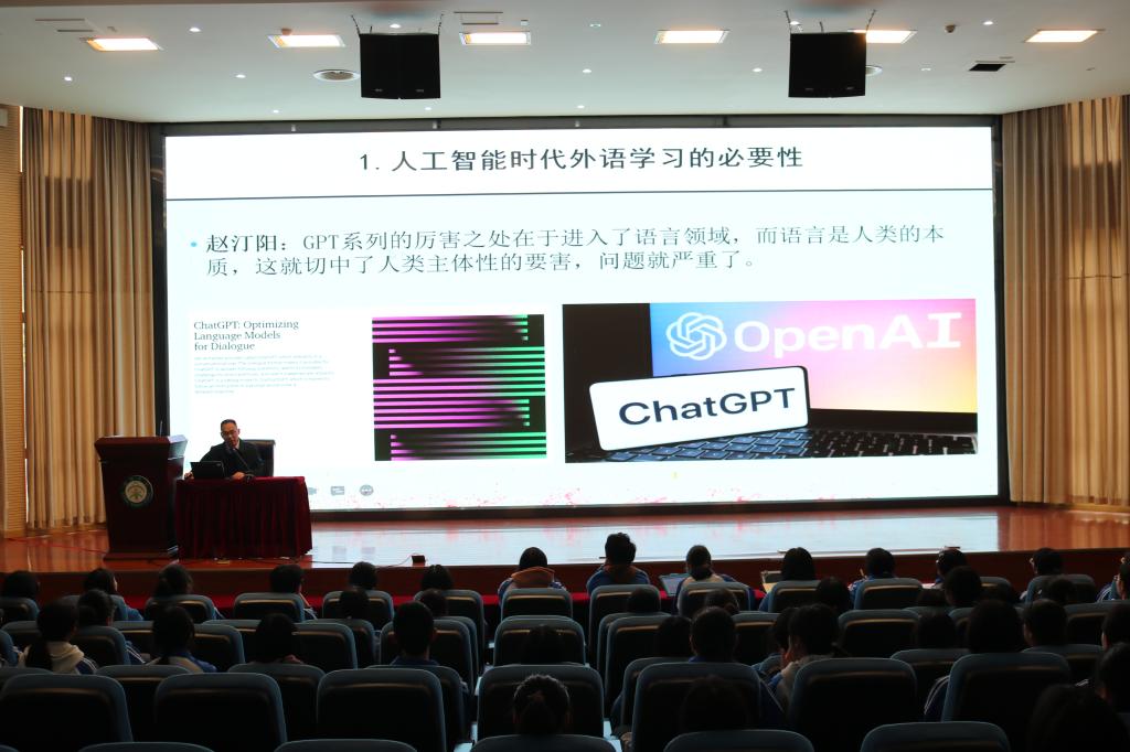 在授牌仪式结束后,tyc122cc太阳成集团院长覃江华教授为中学学生做名为《人工智能(AI)时代的外语学习》讲座,从人工智能ChatGPT对语言学习的挑战为切入点,与学生们共同探讨了学习外语的必要性、如何面对新时代的外语学习。