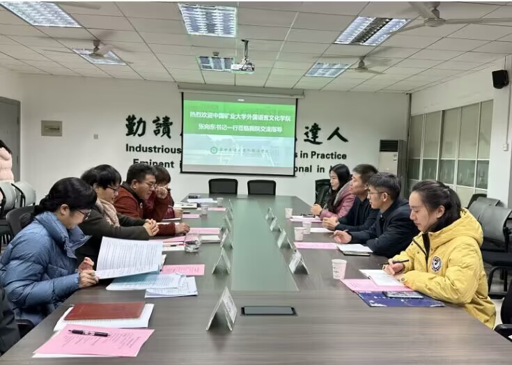 12月14日上午,中国矿业大学外国语言文化学院党委书记张向东、党委副书记朱正中、英德教师党支部书记刘洋、党政办主任陈娅等一行4人来我院调研交流。院党委书记冯国林、副院长秦发兰、教工党支部书记代表及党务工作人员参加座谈交流。