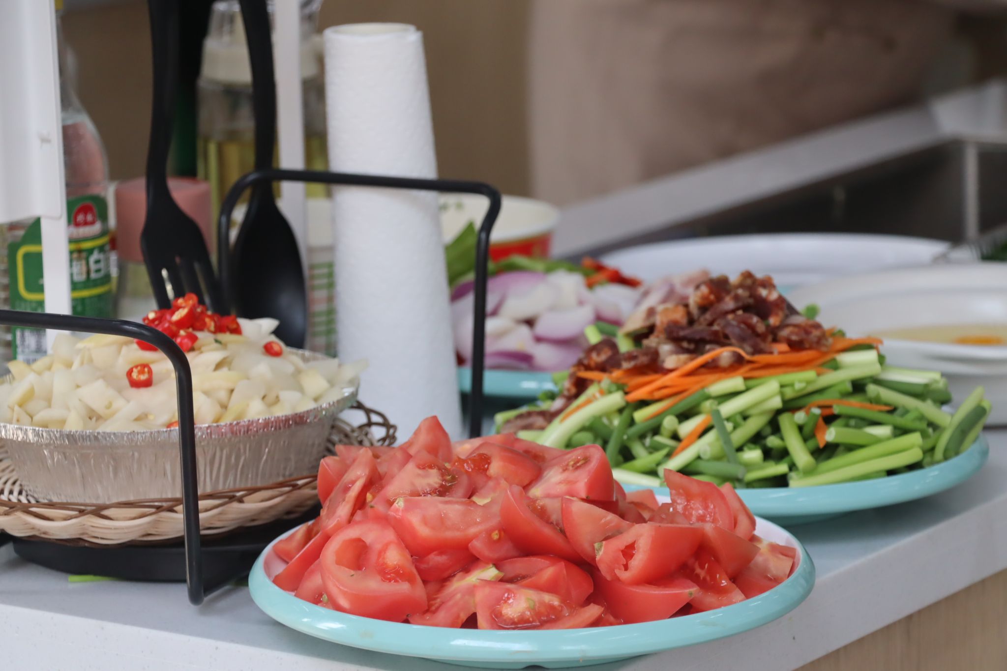正是晴空朗朗,老师们满怀期待,携带着精心准备的食材,陆续到达活动现场,准备在美食烹饪环节大展身手。活动伊始,老师们分组协作,在灶台前井然有序地开展备料、烹饪、装盘等各个环节。