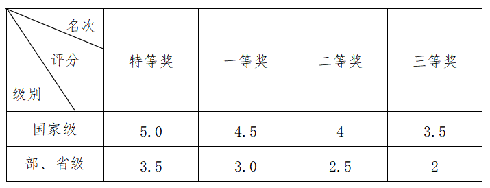 评分依据比赛级别和获奖名次计分;比赛若设一、二、三等奖和优秀奖,奖励分对应分值为:一等奖对应第1名的分值,二等奖对应第2、3名的平均分值,三等奖对应第4、5、6名的平均分值,优秀奖对应第7、8名的平均分值;比赛若只设优秀奖,优秀奖奖励分的对应分值为1-8名的平均分值。若比赛奖项设置有“特等奖”,则“特等奖”相当于“一等奖”,一等奖相当于“二等奖”,依次类推。详见下表: